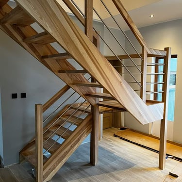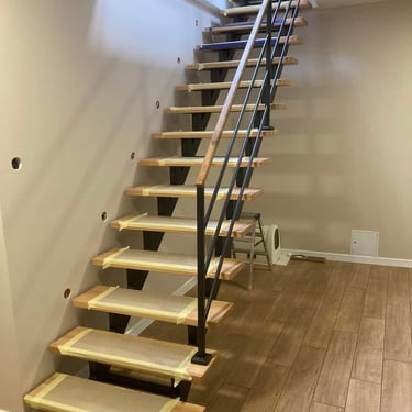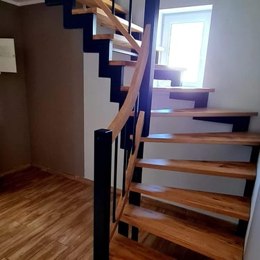 Zdjęcia przedstawiają etapy wykończenia wnętrz, obejmujące montaż schodów, zabudowy kuchennej oraz elementów wyposażenia. Ukazują efekt końcowy prac, w których wnętrza nabierają estetycznego wyglądu i są gotowe do użytkowania.