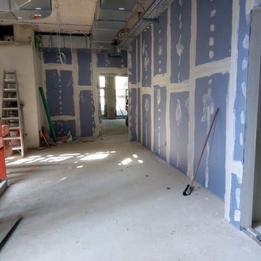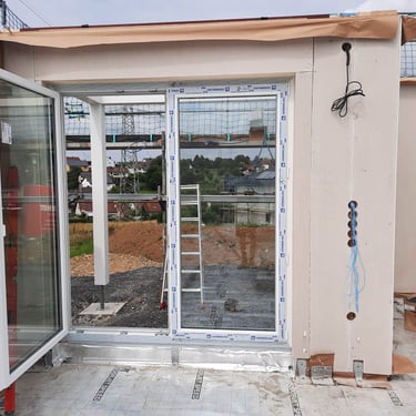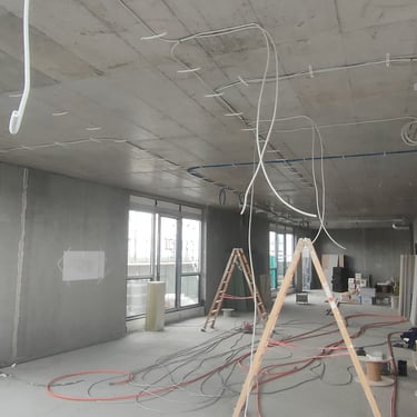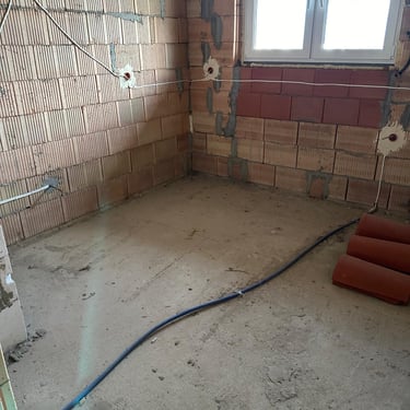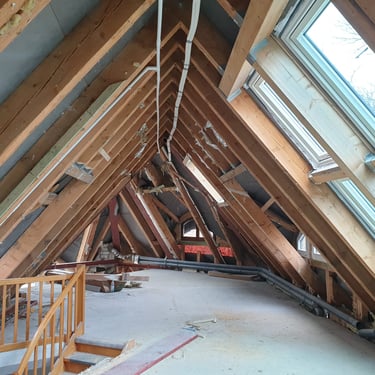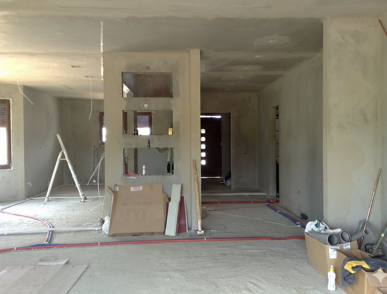 Zdjęcia przedstawiają różne etapy remontów i prac wykończeniowych wewnątrz budynków. Widać tu przygotowanie ścian, instalacje elektryczne, zabudowy z płyt g-k, a także adaptację poddaszy. Fotografie pokazują, jak wnętrza stopniowo nabierają kształtu i są przygotowywane do dalszych prac wykończeniowych.