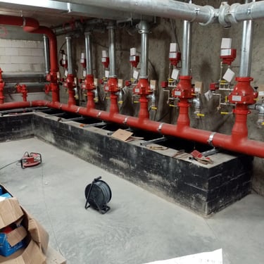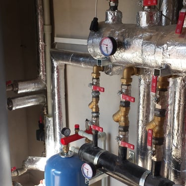 Zdjęcia przedstawiają trzy kluczowe typy instalacji hydraulicznych, które są niezbędne w nowoczesnym budownictwie. Pierwsze to instalacja grzewcza, widoczna po izolowanych rurach i licznych zaworach, służąca do dostarczania ciepła. Drugie to system przeciwpożarowy, łatwo rozpoznawalny dzięki charakterystycznym, czerwonym rurkom, gotowy do działania w razie pożaru. Trzecie zdjęcie przedstawia część instalacji sanitarnej, w tym niebieskie naczynie wzbiorcze, które pomaga regulować ciśnienie wody w obiegu.