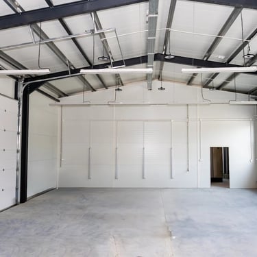 Zdjęcia przedstawiają kompleksowy proces budowy hali przemysłowej na konstrukcji metalowej. Odwzorowują one kolejne etapy prac od postawienia stalowego szkieletu, który stanowi fundament całej konstrukcji, aż po wzniesienie gotowej bryły z dachem i elewacją. Wnętrze hali, jeszcze puste i niezagospodarowane, jest już wyposażone w oświetlenie oraz bramy wjazdowe, co oznacza, że jest ono gotowe do dalszego zagospodarowania i montażu maszyn.